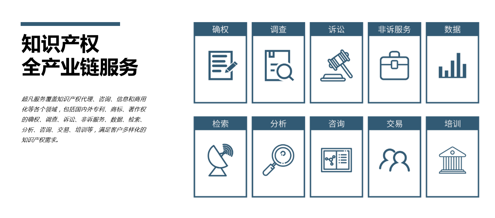 超凡设立了包括知识产权代理公司、律师事务所、知识产权咨询公司、知识产权运营公司、知识产权培训公司、知识产权研究院在内的30余家知识产权服务机构,形成了集“确权、调查、诉讼、非诉服务、数据、检索、分析、咨询、交易、培训”等知识产权全产业链发展的格局。目前,超凡在全国22个城市设立了本地化服务机构,覆盖了北京、成都、深圳、广州、杭州、重庆、长沙、武汉、苏州、南京、天津、上海、青岛、佛山、济南、郑州、沈阳、常州等22个城市。